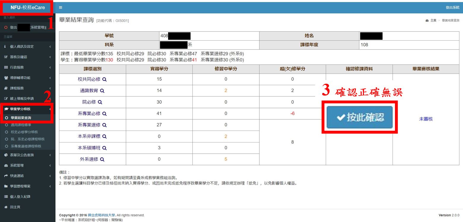 一、畢業學分檢核位址:【學校首頁→使用者入口列→在校學生→ 校務行政e化資訊平台(校務eCare) →畢業學分檢核→畢業結果查詢】 (網址: https://ecare.nfu.edu.tw/)。